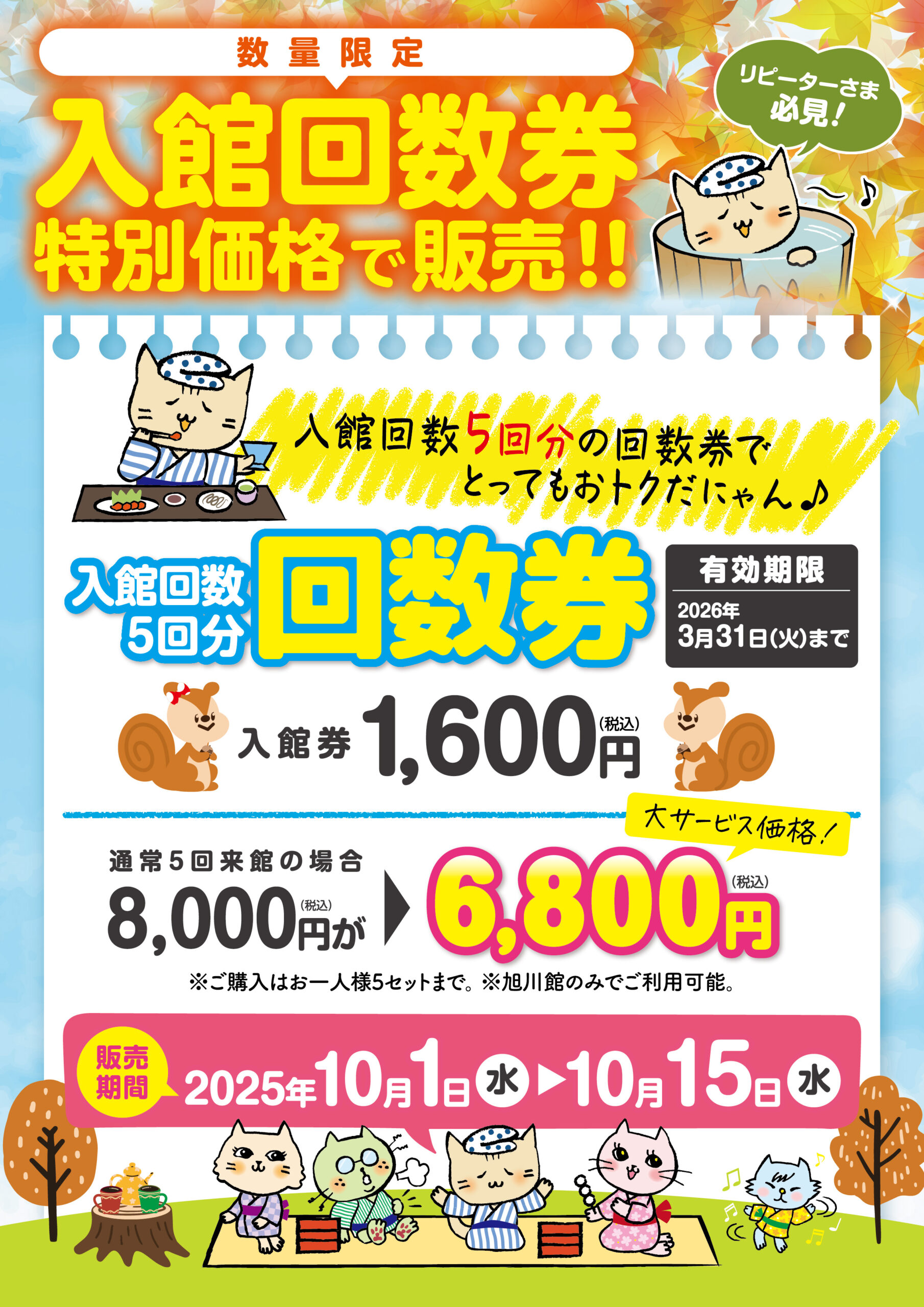 豊かな自然に包み込まれた 高砂台に在る癒しの郷。 大雪山国立公園の大自然と周囲の山並み、そして石狩川と 多くの支流が織り成す自然豊かなまち、旭川市。 万葉の湯は「浸かる」「憩う」「食べる」の三要素が充実し た施設として、より上質のくつろぎを求める方々に愛される 憩いの場を目指しています。 入館料 (平日大人) 1,600 (税込)