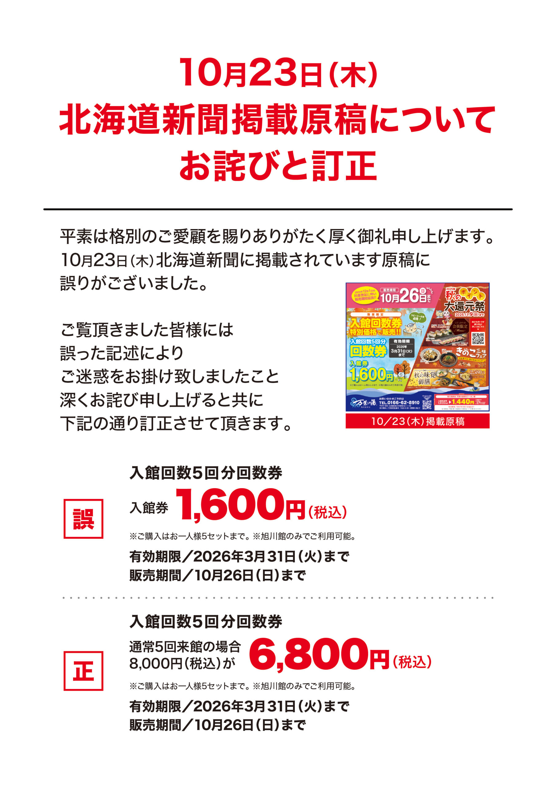 2025年10月23日(木)付の北海道新聞に掲載された広告におきまして、入館回数券の価格表記に誤りがございました。