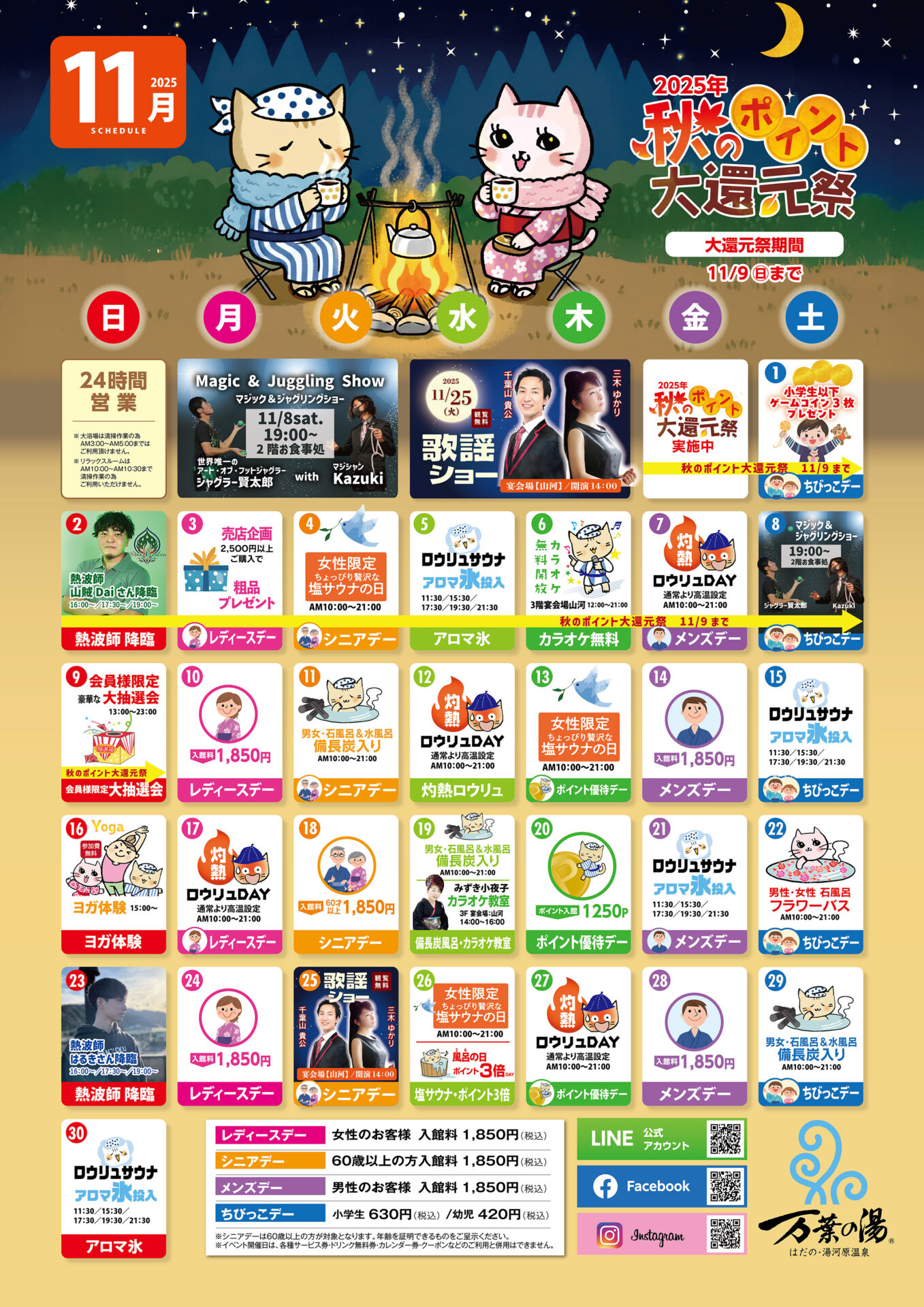 2025.10.26 🗓️11月のイベントカレンダー🗓️ \11月のイベントのご案内です‼/ 11月は「抽選会」や「売店企画」、「熱波師イベント」など楽しい企画がたくさん👀‼ だんだんと肌寒くなってくる時期。。 ぜひ体を温めに、はだの館へご来館下さい🎵 ※イベントカレンダーは毎月26日頃の配信を予定しています。
