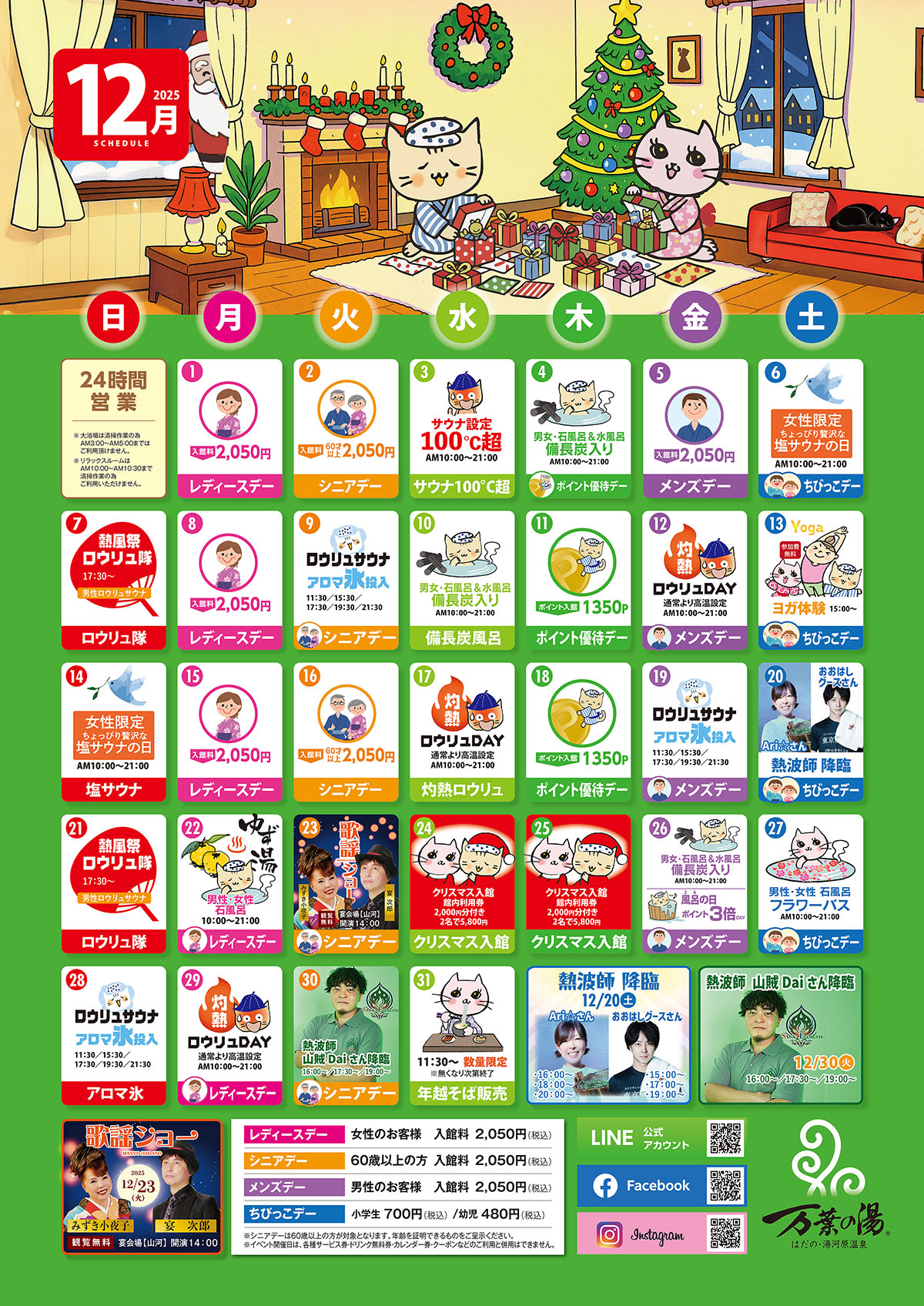 2025.11.26 🗓️12月のイベントカレンダー🗓️ \12月のイベントのご案内です‼/ 12月は、「熱波師イベント」「年越しそば販売」など楽しい企画がたくさん✨ ぜひはだの館へご来館下さい🎵 ※イベントカレンダーは毎月26日頃の配信を予定しています。