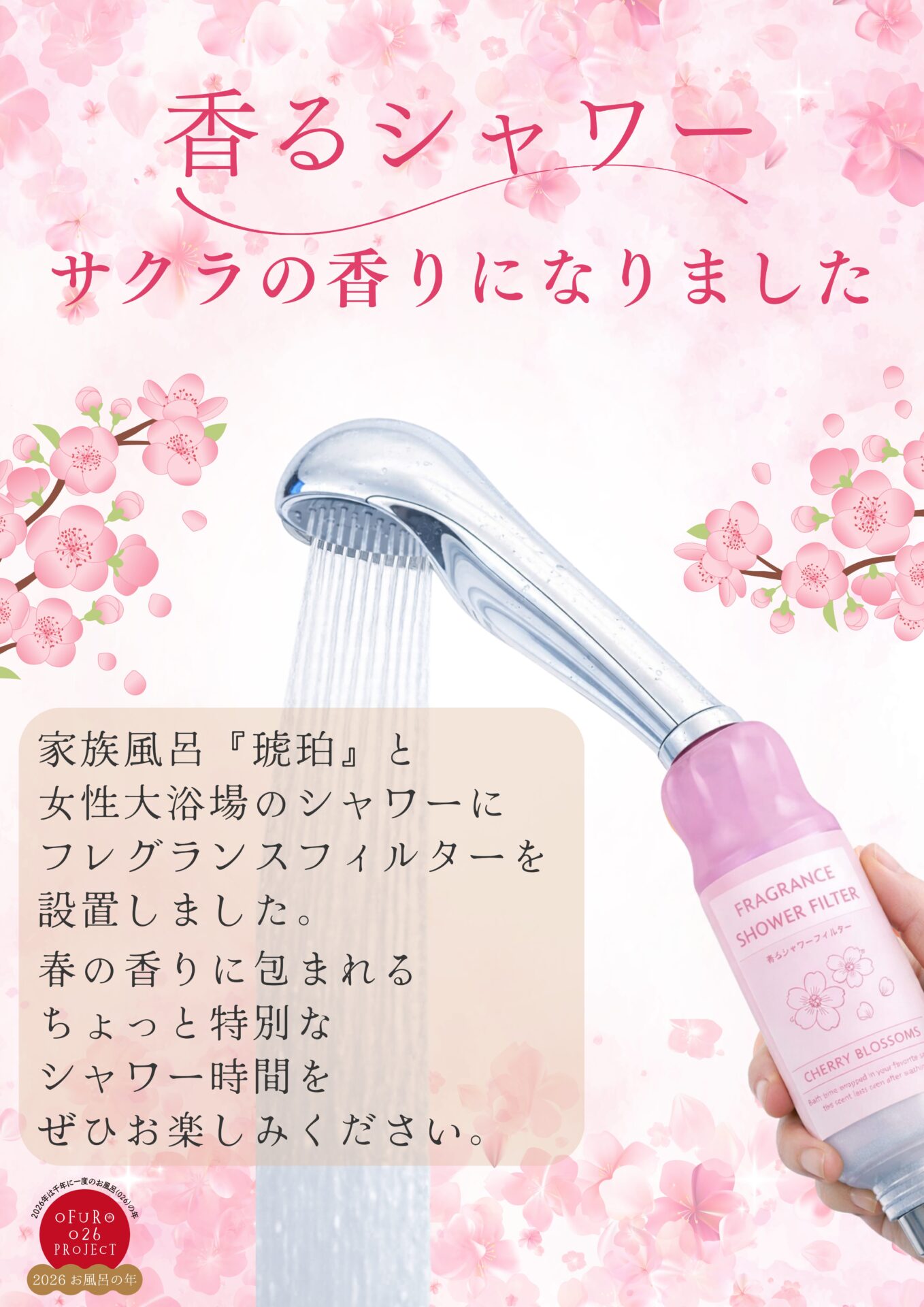 2026.03.14 🌸香るシャワー「サクラ」登場!!🚿 女性大浴場の数か所と、貸切風呂「琥珀」に‘‘香るシャワー’’を導入!! 前回の「バラ」の香りに続いて、3月14日から「サクラ」の香りになりました😊 まだ試していない方も、一度お試し下さい☝