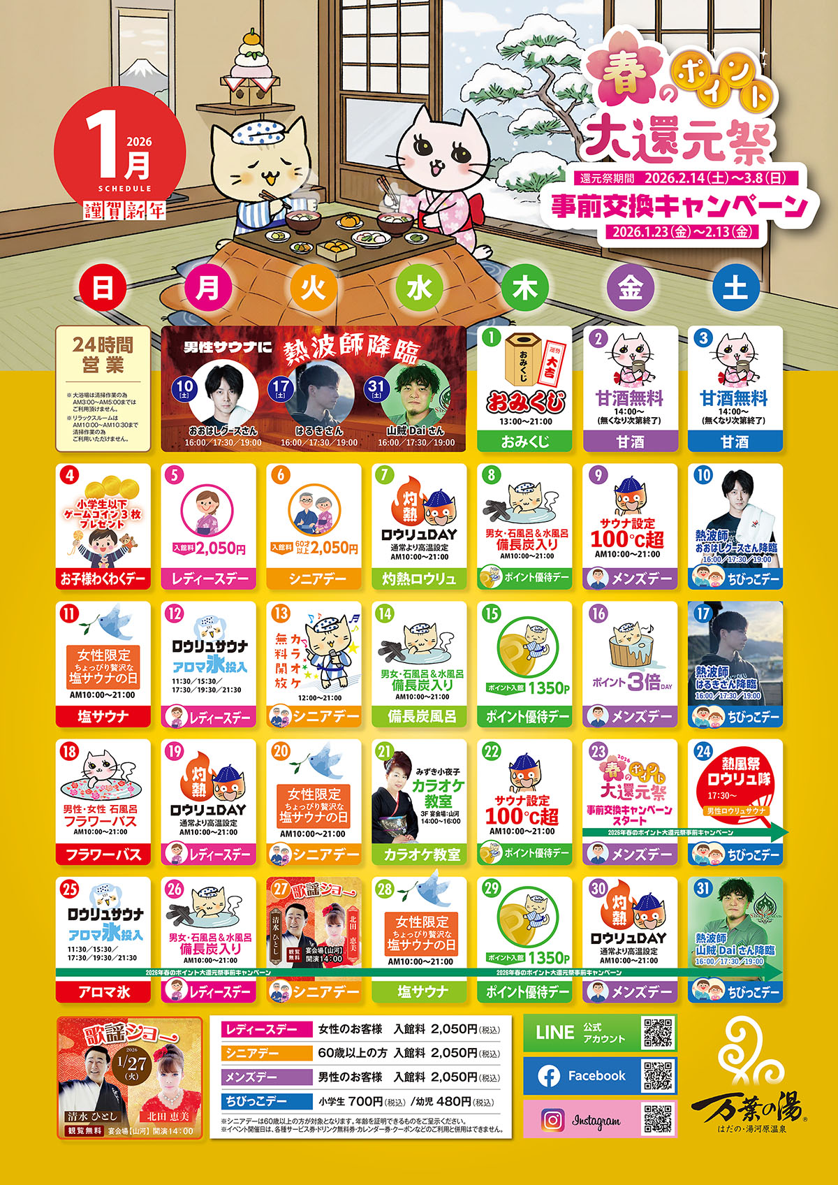 1月は、「お正月特別イベント」「熱波師降臨」など楽しい企画がたくさん✨