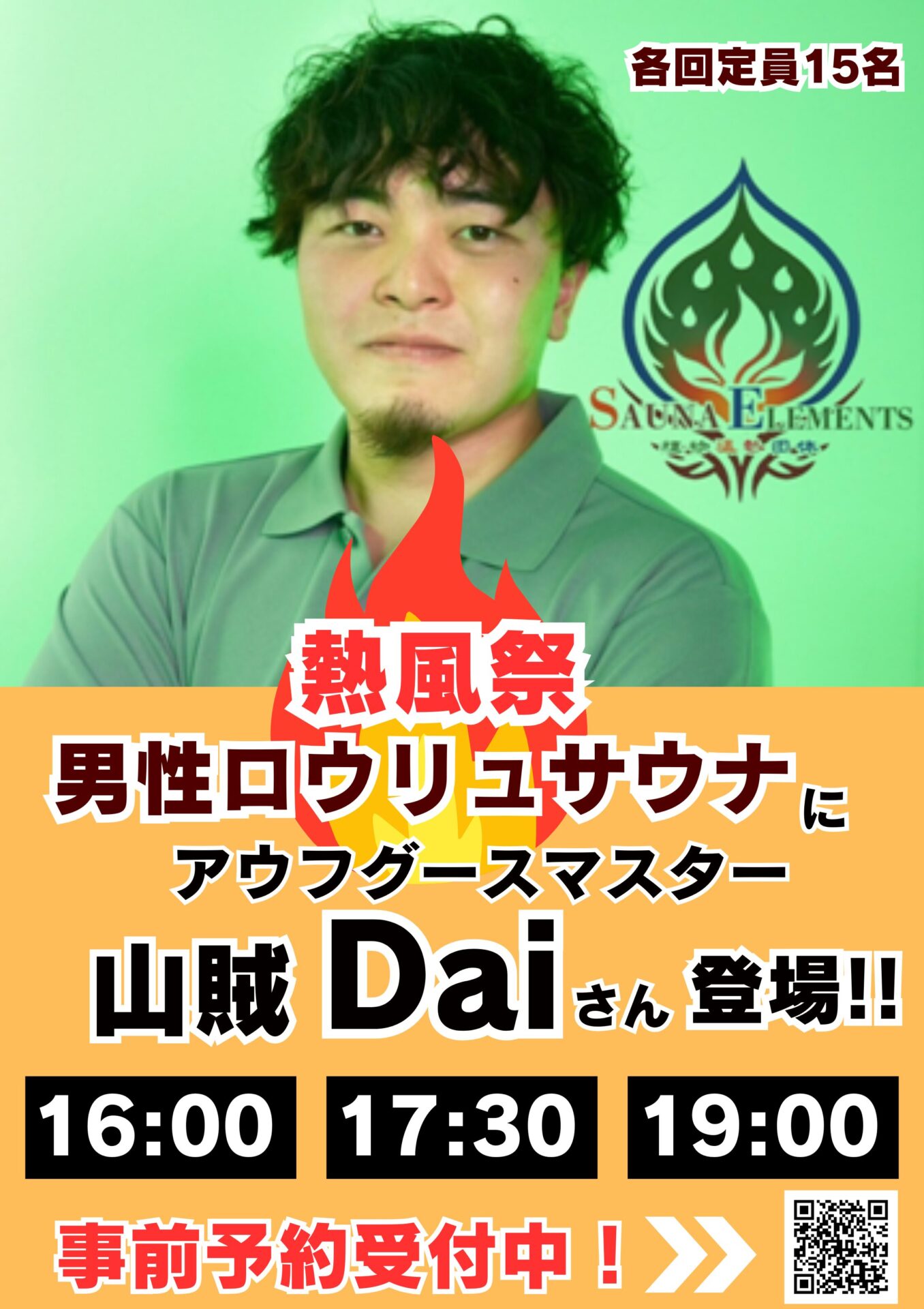 2026.01.27 1月31日(土) 🔥アウフグースマスター山賊Daiさん🔥降臨!! 1月31日(土) 「アウフグースマスター 山賊 Daiさん」が万葉の湯 はだの館 男性ロウリュサウナに登場!! 時間は、16:00/17:30/19:00の3回です👨🦱 ぜひ熱々のロウリュをご体感ください🔥 お気軽にご参加ください!
