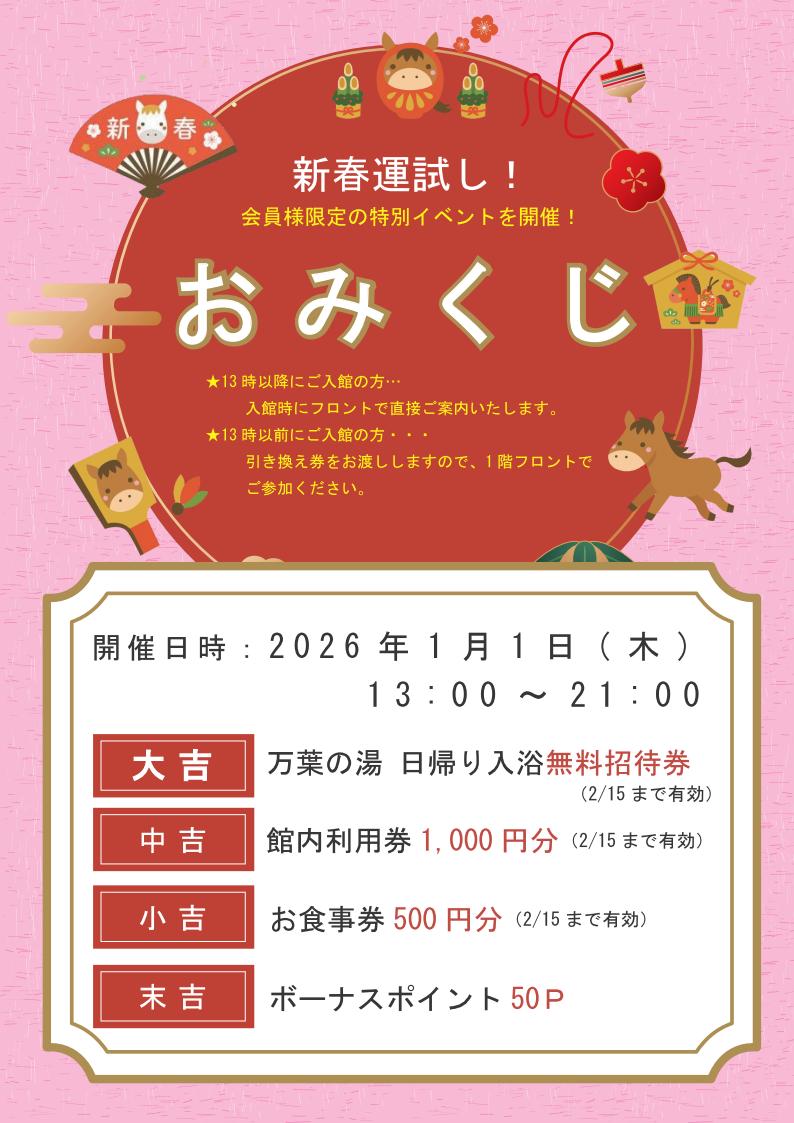 2025.12.23 1月1日(木)おみくじ 🎍 新春運試し!会員様限定「おみくじイベント」🎍 2026年1月1日(木) 13:00~21:00 フロントにて開催 新年の始まりに、ちょっとした運だめしを。万葉の湯 はだの館では、会員様限定の新春特別イベント【おみくじ】を開催いたします!! 引いたおみくじの結果に応じて、日帰り入浴無料招待券など、うれしい特典をプレゼントいたします🎁 新年最初の運試しを、ぜひ万葉の湯 はだの館でお楽しみください🎵皆さまのご来館を心よりお待ちしております✨
