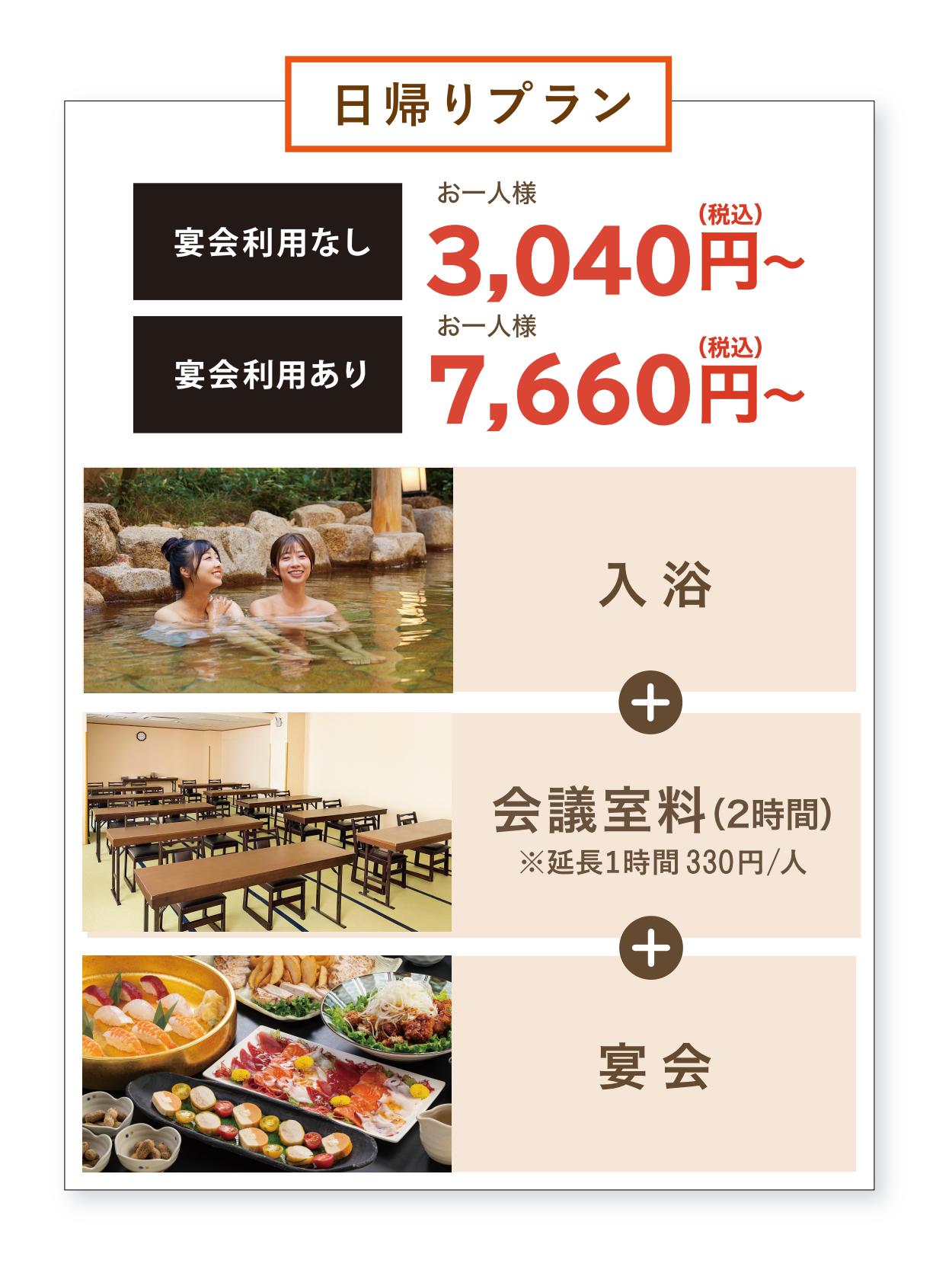 入浴やお食事を組み合わせた「日帰りプラン」と、宿泊を伴う「宿泊プラン」の2種類からお選びいただけます。
