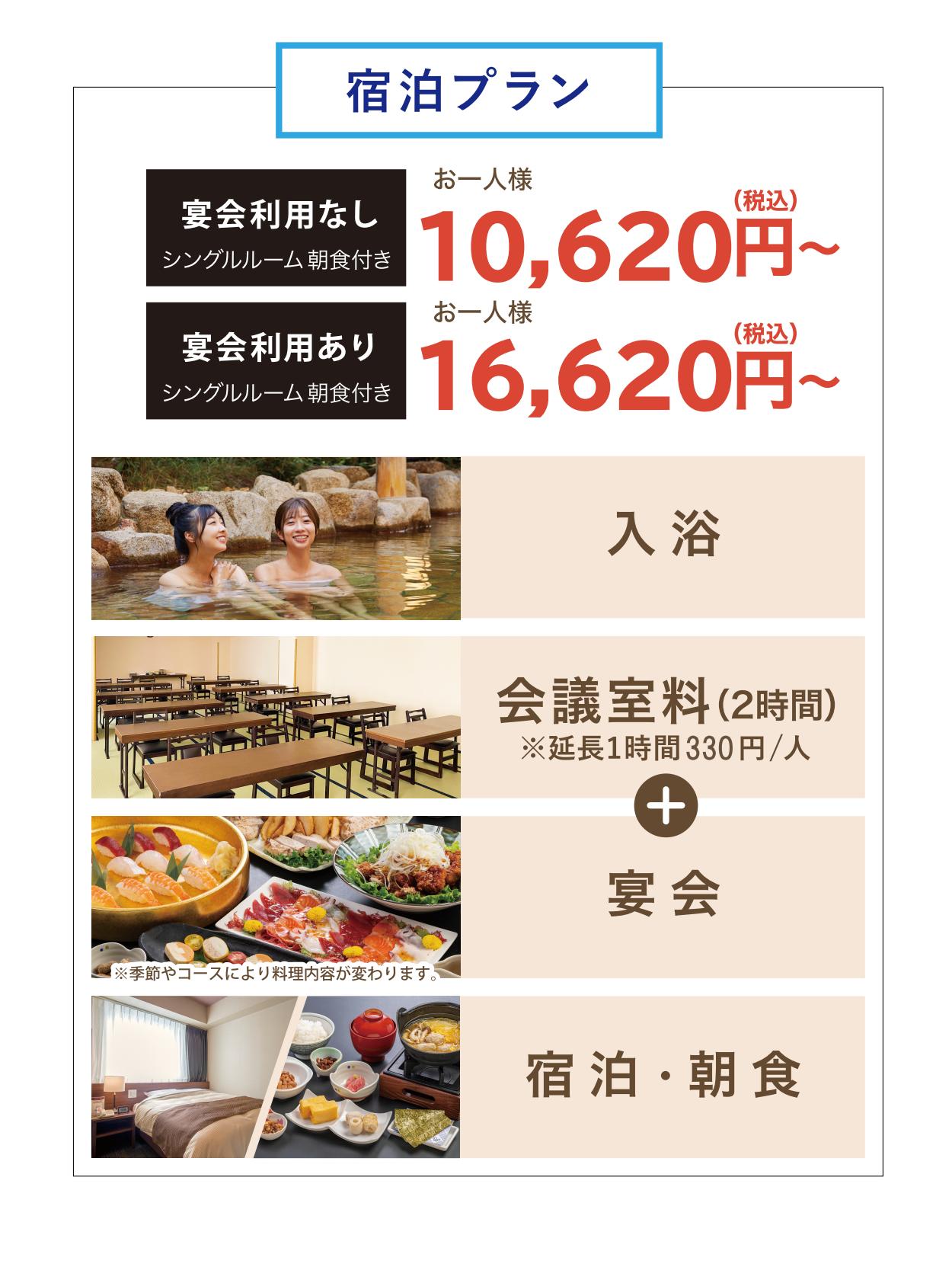 「入館+会議利用+宿泊(朝食付き)」 or 「入館+会議利用+宴会+宿泊(朝食付き)」