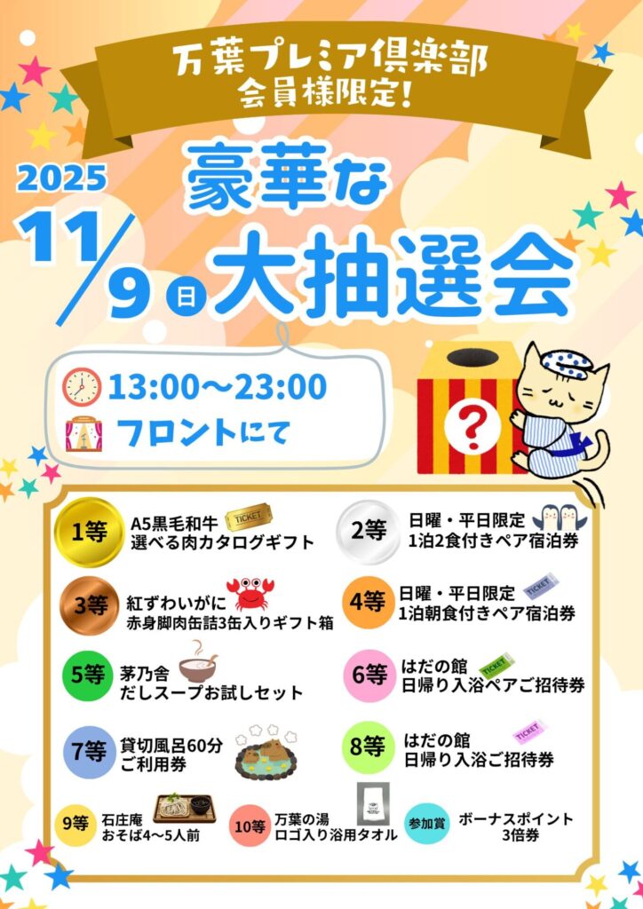 2025.10.16 11月9日(日) 会員様限定☆豪華な大抽選会 ☆プレミア俱楽部会員様限定☆ 「豪華な大抽選会」を開催いたします‼ 日程:11月9日(日) 時間:13:00スタート 場所:フロントにて \豪華な景品が盛りだくさんです!!皆様ふるってご参加ください/