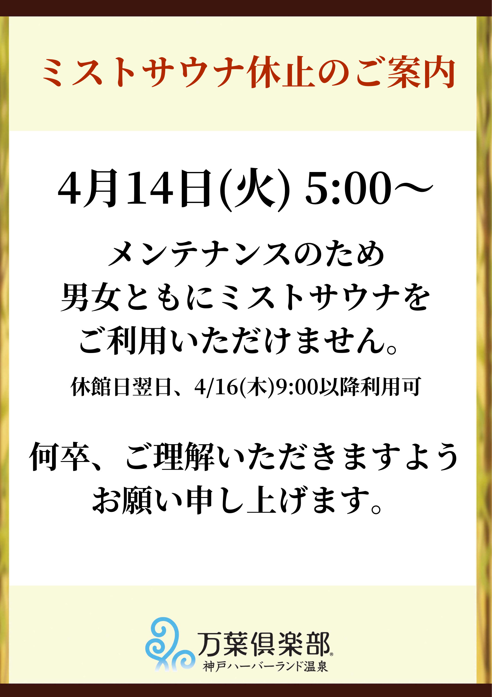 4月14日(火)男女ミストサウナ休止のご案内