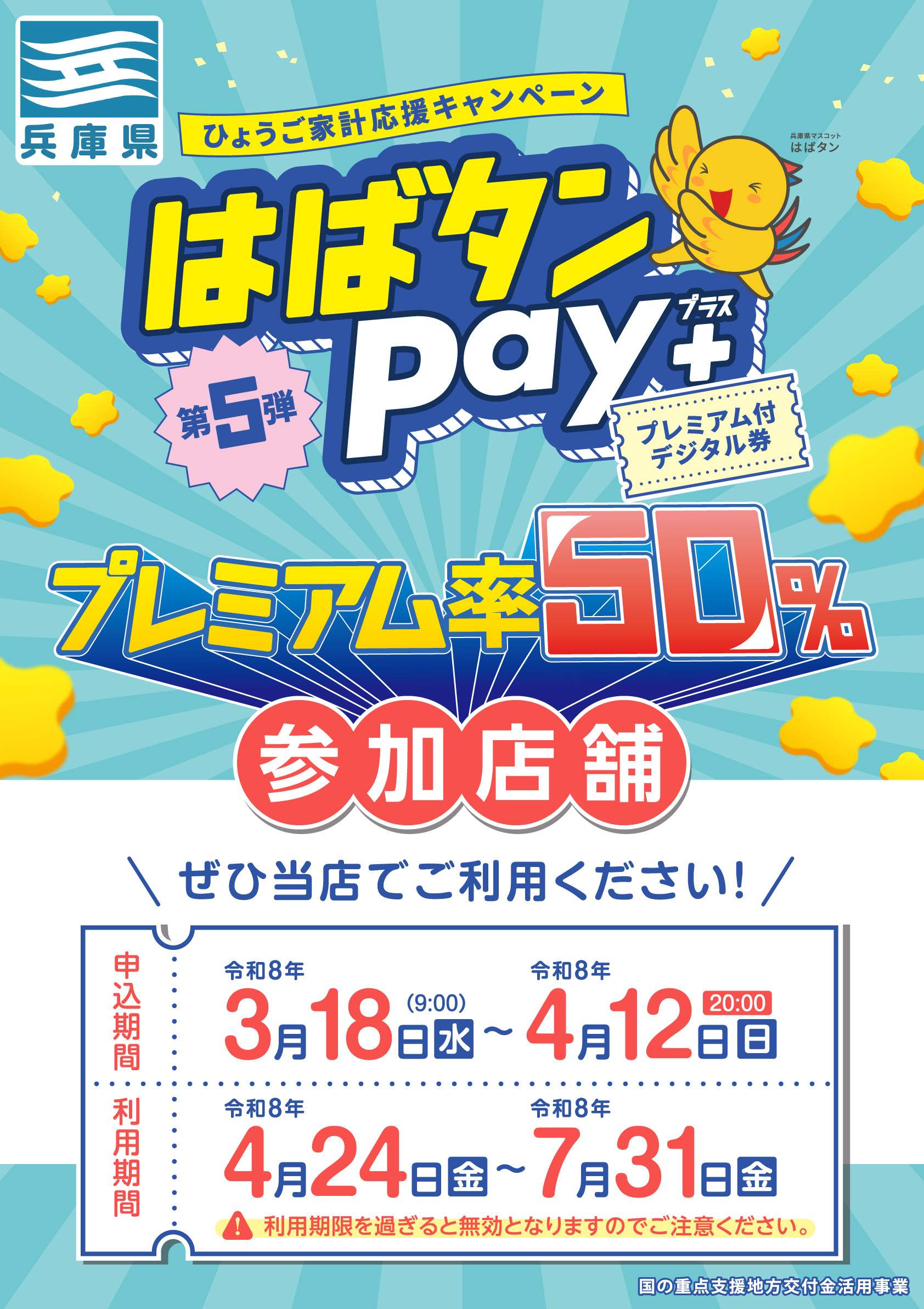 2026.04.23 はばたんpay+5弾 利用可能店舗 はばたんpay+第5弾 利用可能店舗です。 2026年4月24日(金)~2026年7月31日(金)23:59まで利用可能 ※ギフト券・回数券のご購入にはご利用いただけません 詳しくははばたんpay+5弾 公式HPをご確認ください。 ※※はばたんpay+5弾※※