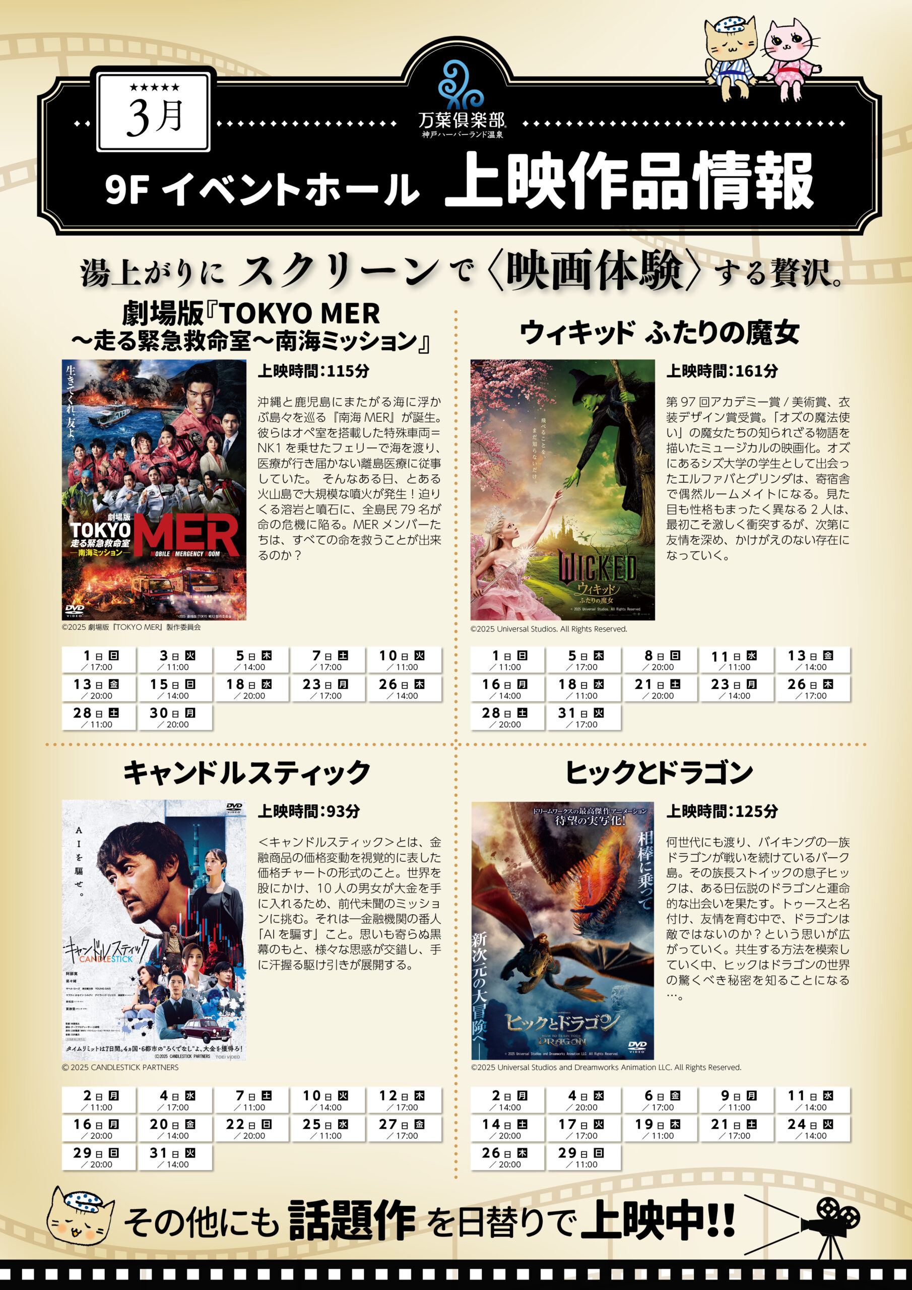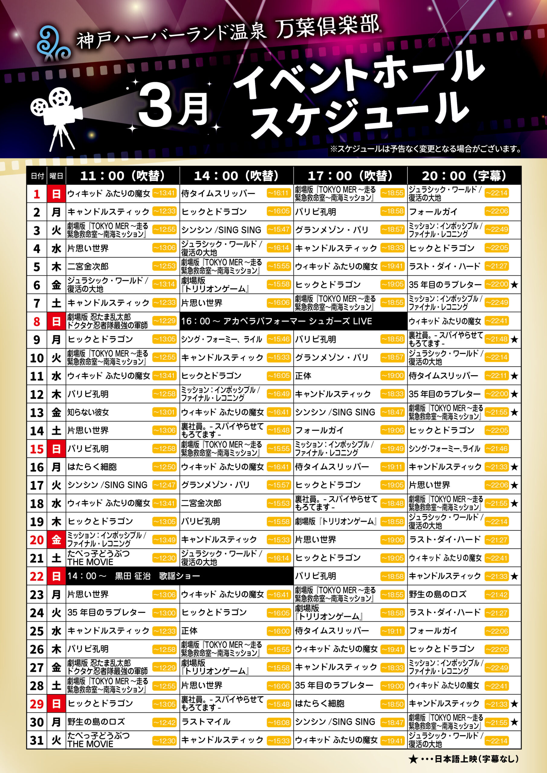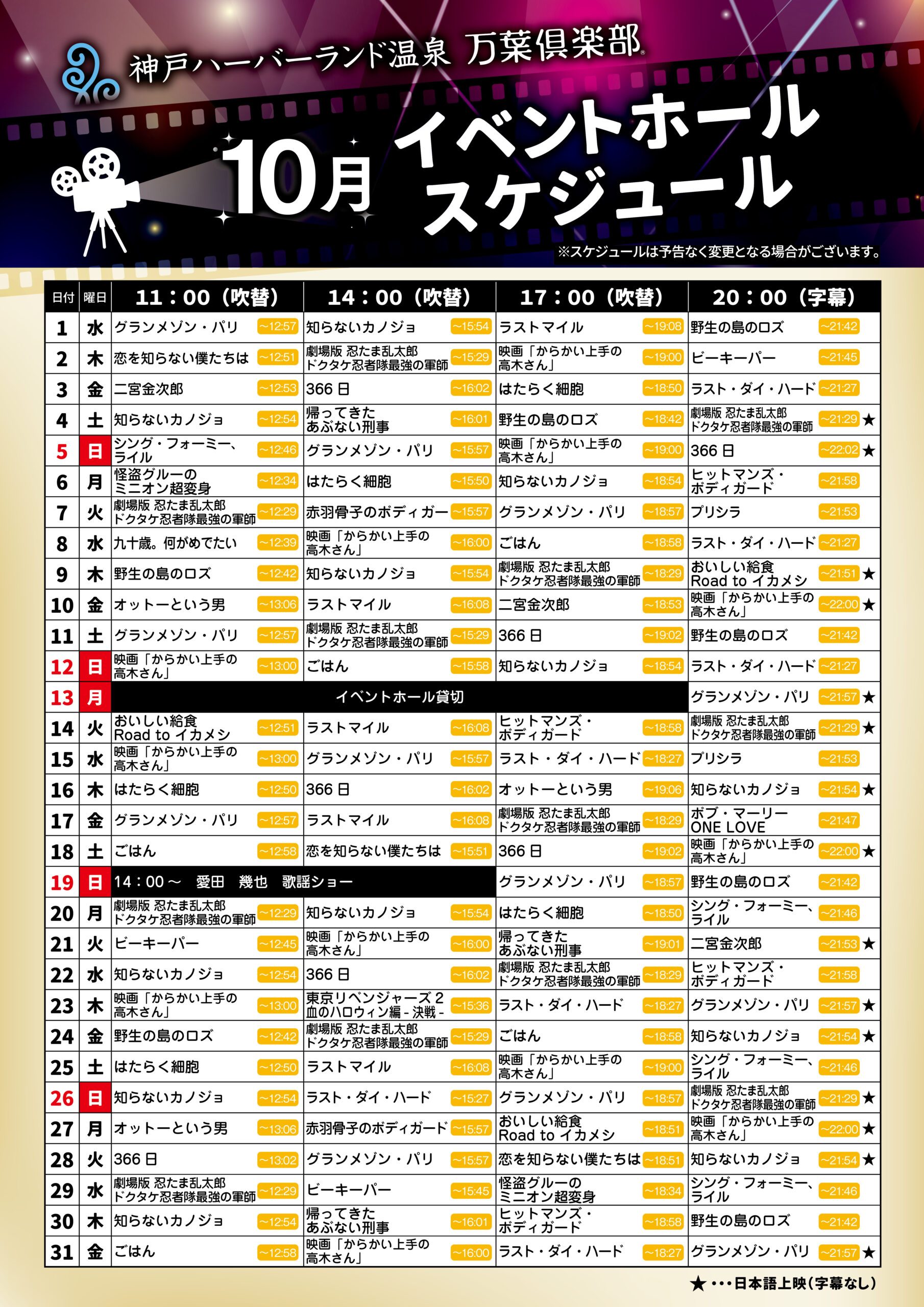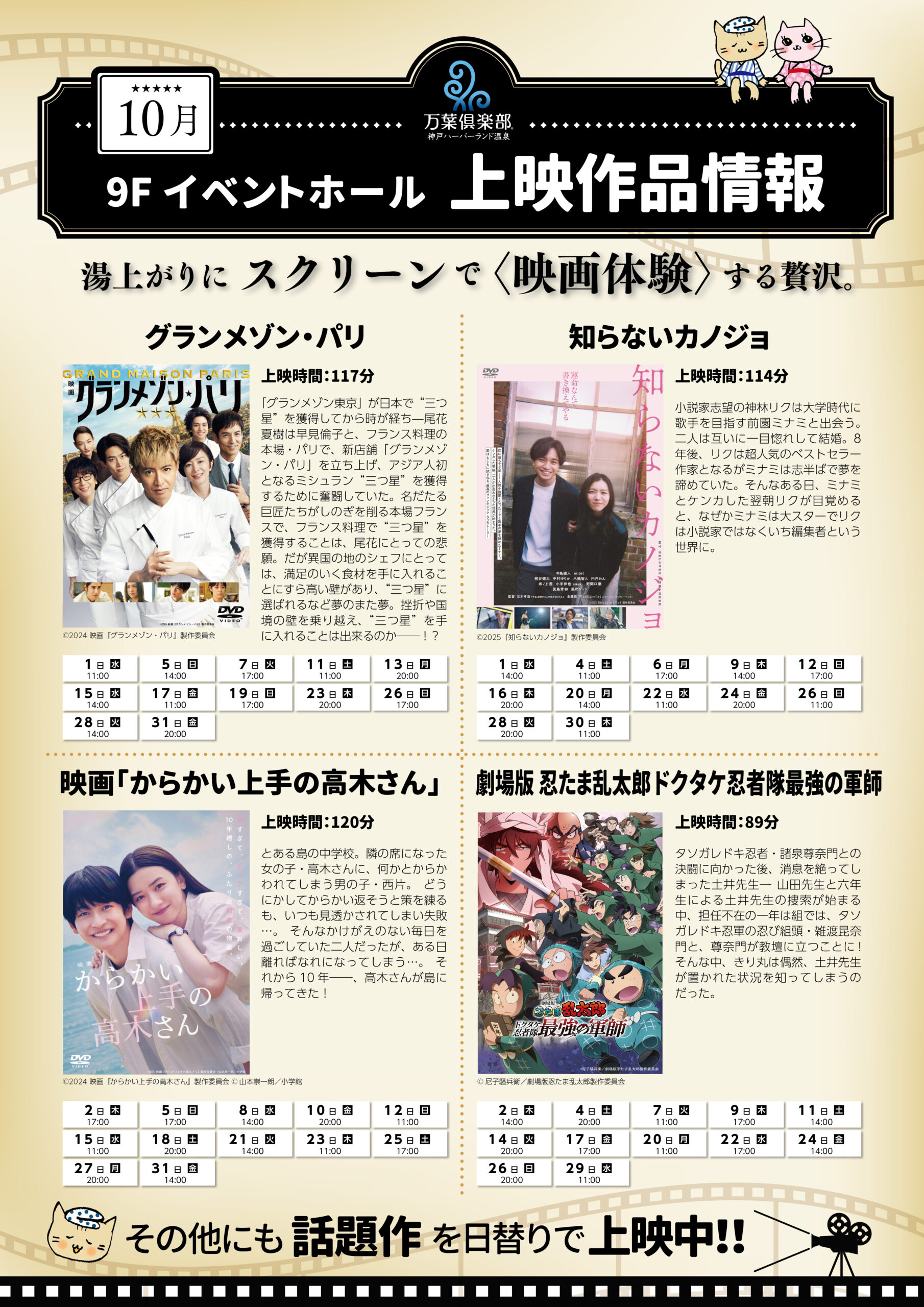 湯上がりに映画を観る贅沢。歌謡ショーや漫才など様々なイベントを毎日実施中。