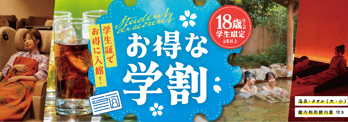 ※18歳未満の方(高校生のみ)のみでのご入館はご遠慮いただいております。ご了承くださいませ。 当施設(日帰り入浴及び宿泊利用共に)は、保護者の方ご同伴にてご利用願います。(18 歳未満の方(高校生のみ)のみのご利用は出来ません。)