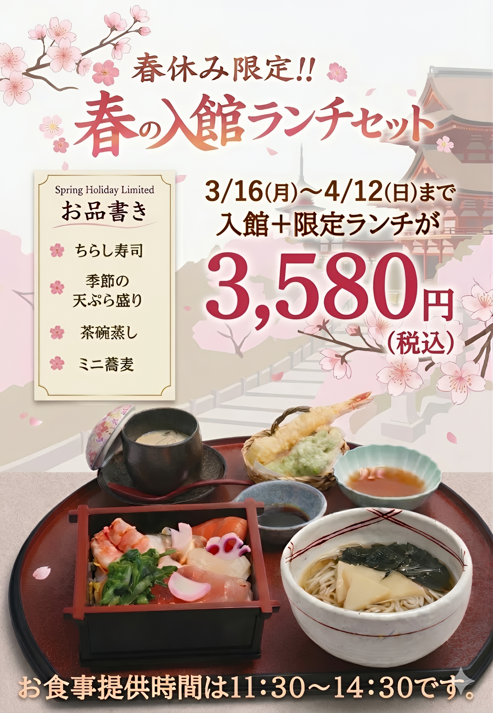 くつろぎプラン・のんびりプランのご紹介 くつろぎプラン 入館×天ぷらお造り御膳がセットとなったお得な […]