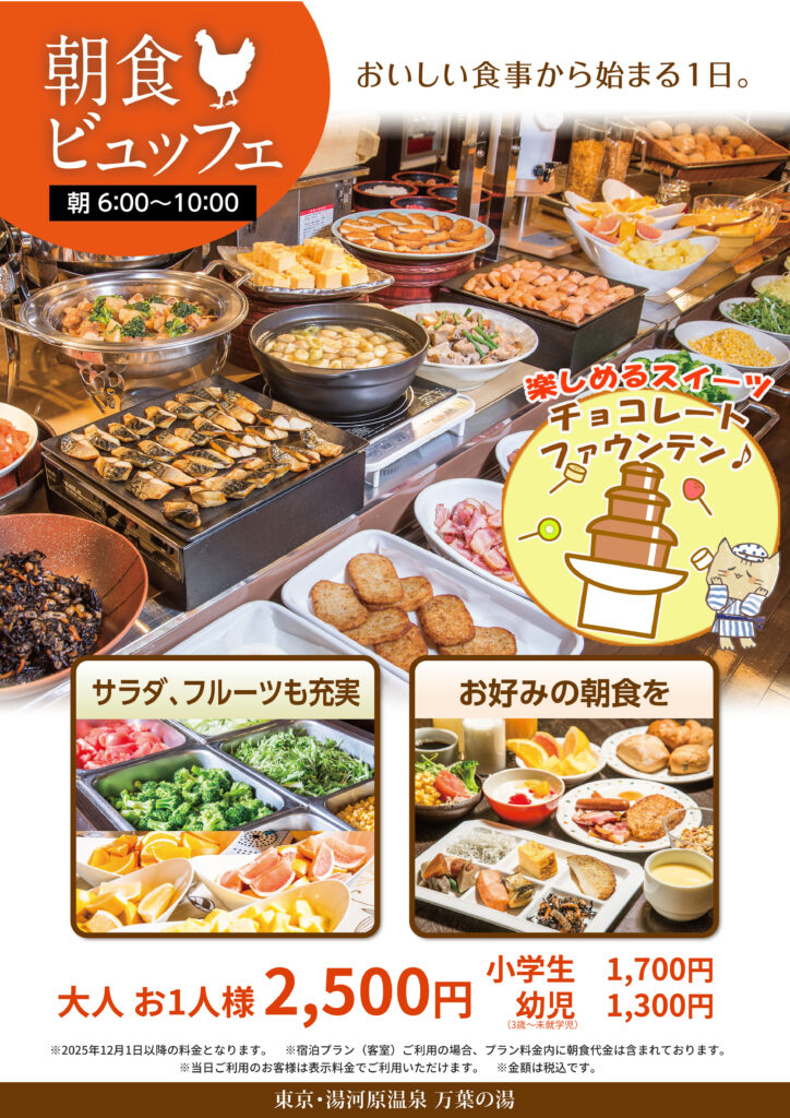 2025.11.30 【朝の活力!】🍚朝食ビュッフェ🍞 ※宿泊プラン(客室)ご利用の場合、プラン料金内に朝食代金は含まれております。 当日ご利用のお客様は表示料金でご利用いただけます。 ●価格改定について:2025年12月2日(火)の朝より、 大人2,500円/小学生1,700円/幼児1,300円に改定させていただきます。