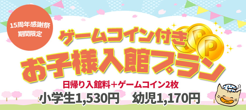 日帰り入館料+ゲームコイン2枚セットを特別価格で!!