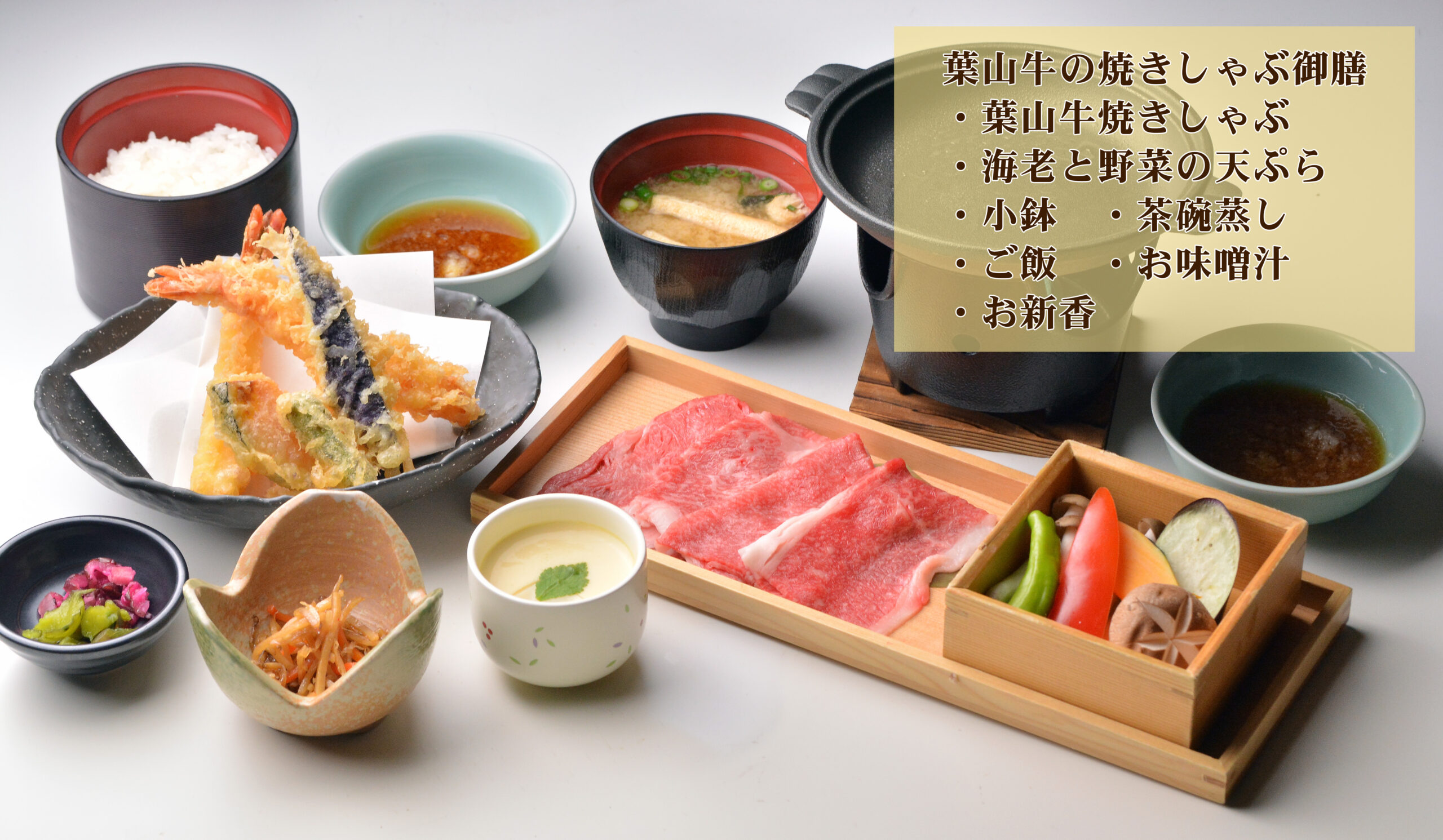 ※特別メニューはご入館当日の22:00までのご提供です。パック料金5,500円の食事内容は「葉山牛の焼きしゃぶ(1人前)」単品メニューとなります。