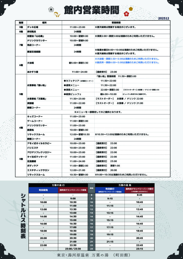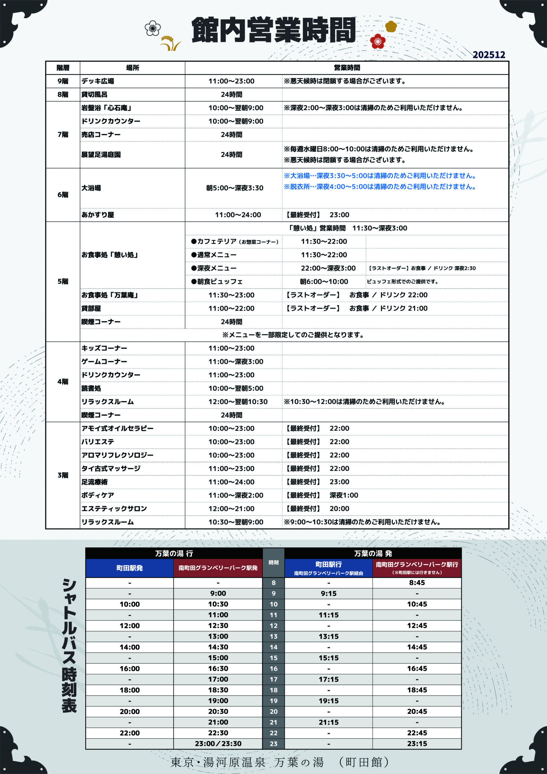 2025.12.01 館内営業時間・各種サービスについて 2025年12月時点の営業時間となります。(あかすり屋営業時間変更) ※各施設の営業時間詳細は下記一覧をご覧下さい。 ※今後の情勢により、営業時間・各種サービス内容は予告なく変更する場合がございます。