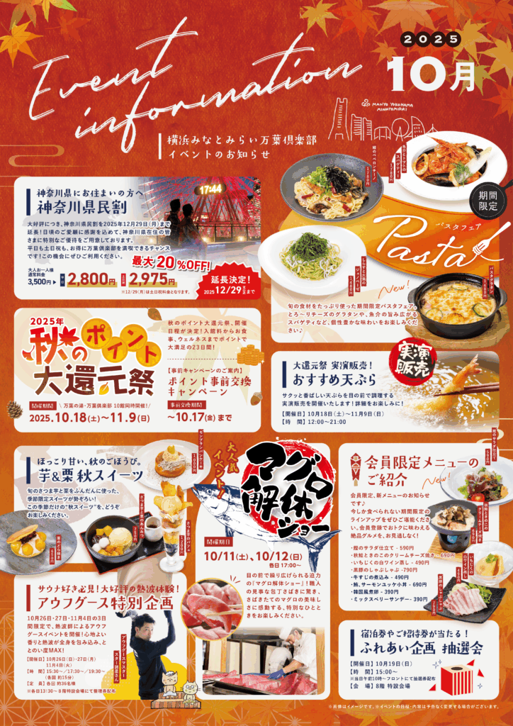 2025.10.01 ★10月イベント情報★ \10月イベント情報/ ・神奈川県民割 12/29まで延長決定! ・秋のポイント大還元祭 10/18~11/9 ・期間限定 パスタフェア ・芋&栗 秋スイーツ ・サウナ―必見!アウフグース 10/26・27 ・10月の会員限定メニュー ・ふれあい企画 大抽選会 10/19 15:00 ・まぐろ解体ショー 10/11・12