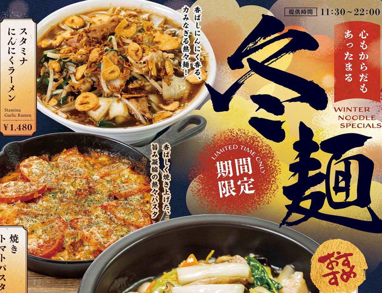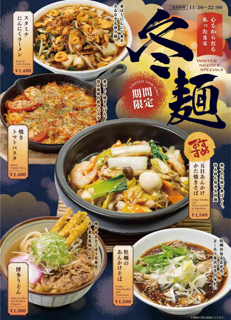 2025.11.09 こころもからだもあったまる「冬麺」登場! 11/10~販売開始 期間限定「冬麺」登場! ・五目あんかけかた焼きそば 1,580円 ・スタミナにんにくラーメン 1,480円 ・焼きトマトパスタ 1,480円 ・牡蠣のあんかけそば 1,580円 ・博多うどん 1,380円 6階 食事処 11:30~22:00