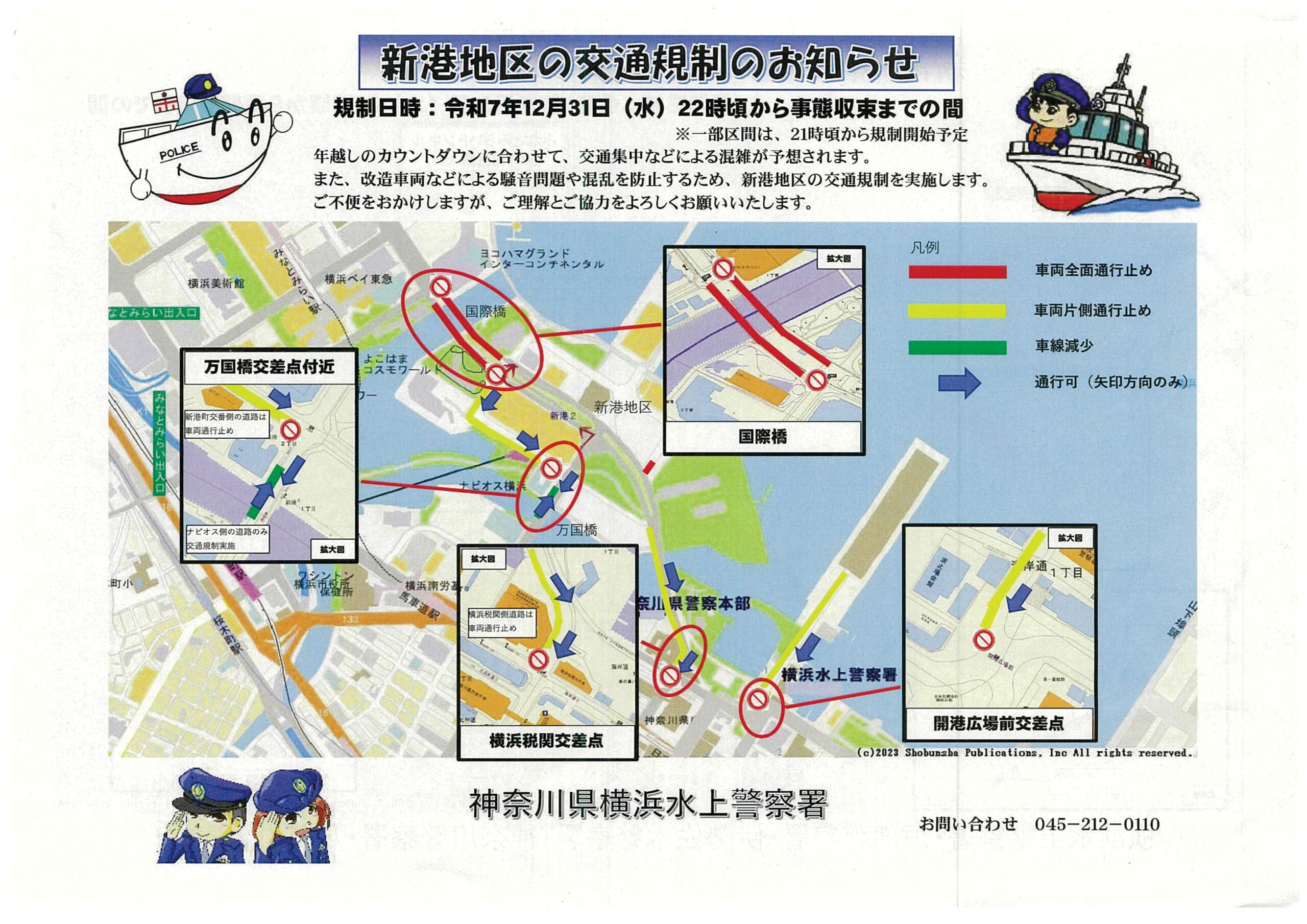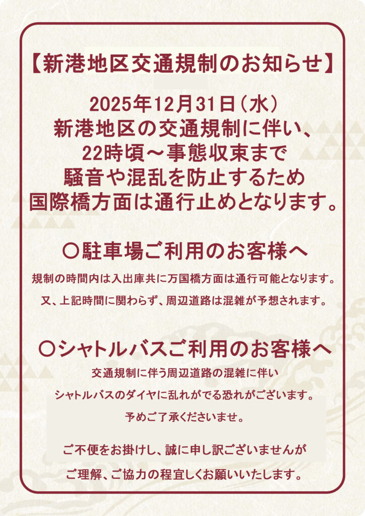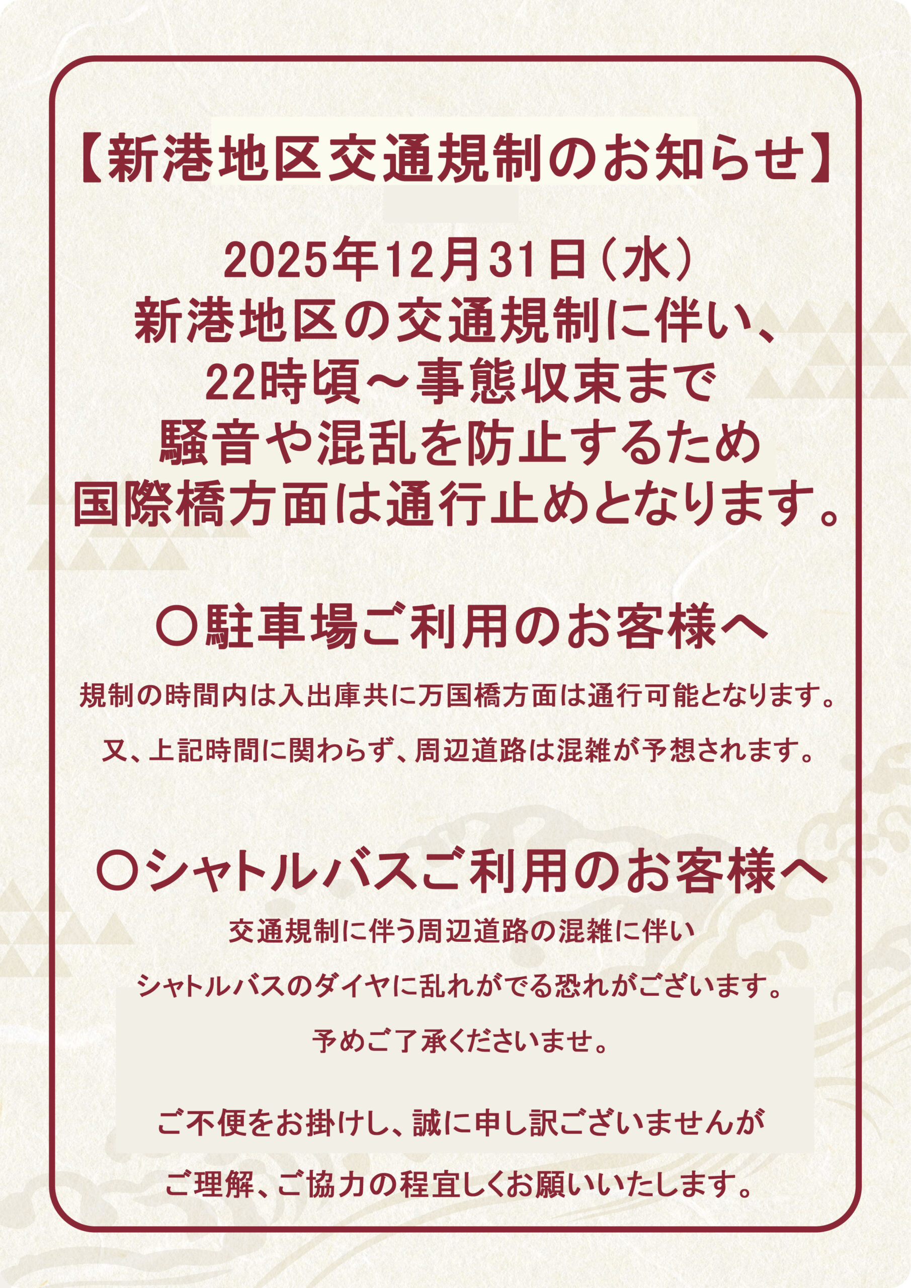 2025.12.14 大晦日 新港地区交通規制のお知らせ 年越しのカウントダウンに合わせて、交通の集中、改造車両による混乱を防止するため、新港地区にて交通規制が実施されます。 国際橋は車両通行止めとなります。車両の出入りは万国橋からのみとなります。※歩行者は通行可。 ご不便をお掛けしますがご認識の程宜しくお願い申し上げます。