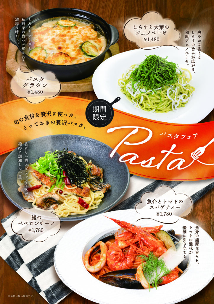 2025.10.07 期間限定 パスタフェア 旬の食材を贅沢に使った、 とっておきの贅沢パスタ ・魚介とトマトのスパゲティー 1,780円 ・パスタグラタン 1,480円 ・しらすと大葉のジェノベーゼ 1,480円 ・鰻のペペロンチーノ 1,780円
