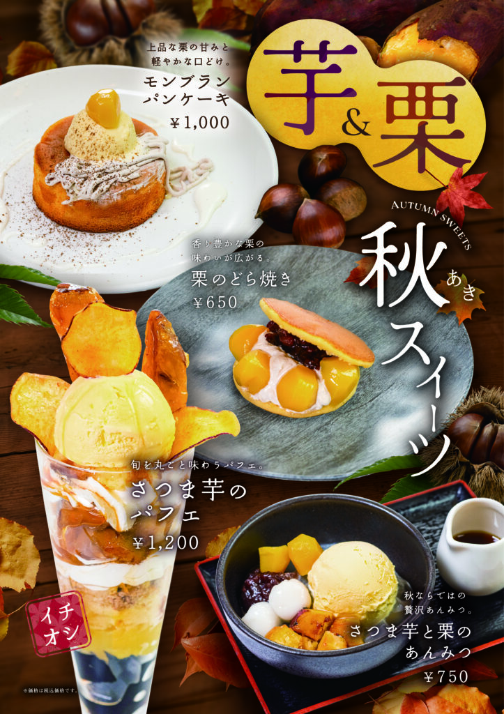 2025.10.07 芋&栗 秋のスイーツ 秋の味覚「芋&栗」を使用した秋スイーツ新登場! ・さつま芋のパフェ 1,200円 ・モンブランパンケーキ 1,000円 ・栗のどら焼き 650円 ・さつま芋と栗のあんみつ 750円