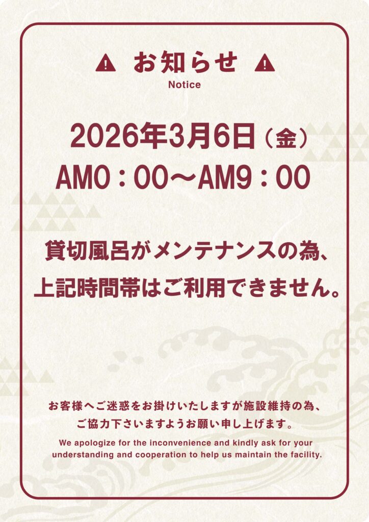 2026.03.05 3月6日(金)貸切風呂メンテナンス 2026年3月6日(金) 深夜0:00~8:00まで 貸切風呂メンテナンスの為、ご利用できません。 お客様にはご迷惑をお掛けいたしますが、 施設維持の為、ご協力のほど、よろしくお願いいたします。