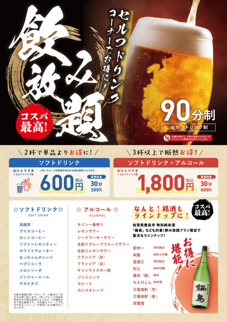 セルフドリンクコーナー飲み放題に佐賀県「鍋島」など銘酒がラインナップ!