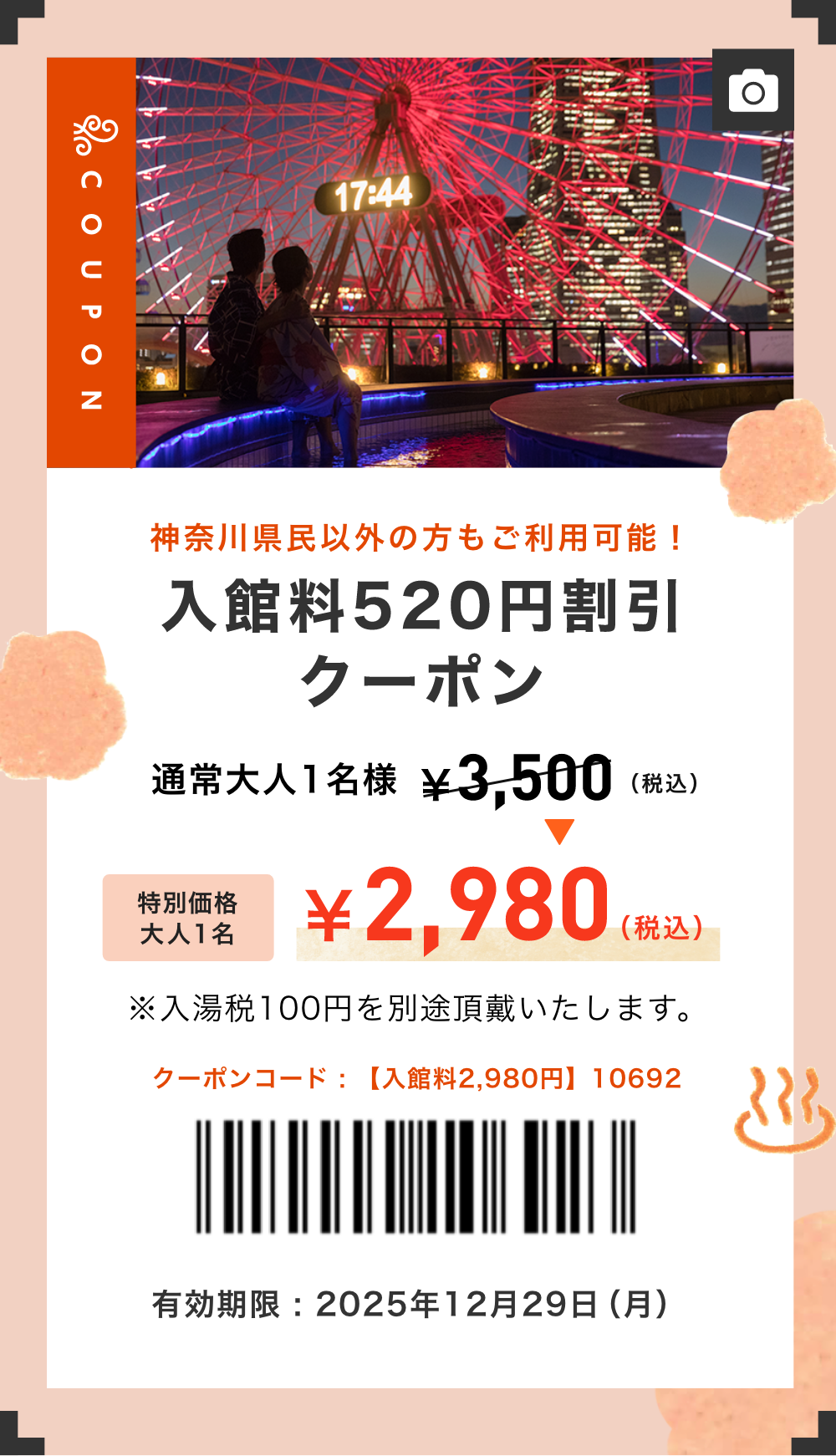 ※横浜みなとみらい万葉倶楽部のみ有効です。
