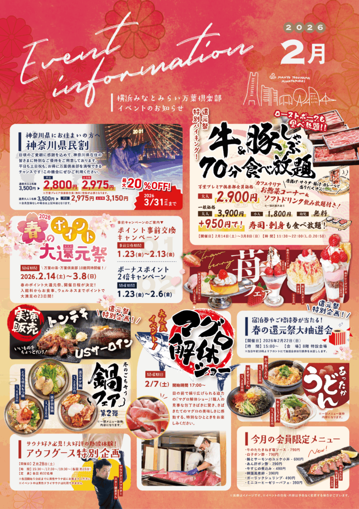 2026.02.02 ★2月イベント情報★ \2月イベント情報/ ・神奈川県民割 3/31まで延長決定! ・春のポイント大還元祭 2/14~3/8 ・牛&豚しゃぶ食べ放題 2/14~ ・苺フェア ・サウナ―必見!アウフグース 2/28 ・2月の会員限定メニュー ・ふれあい企画 大抽選会 2/22 15:00 ・鍋フェア