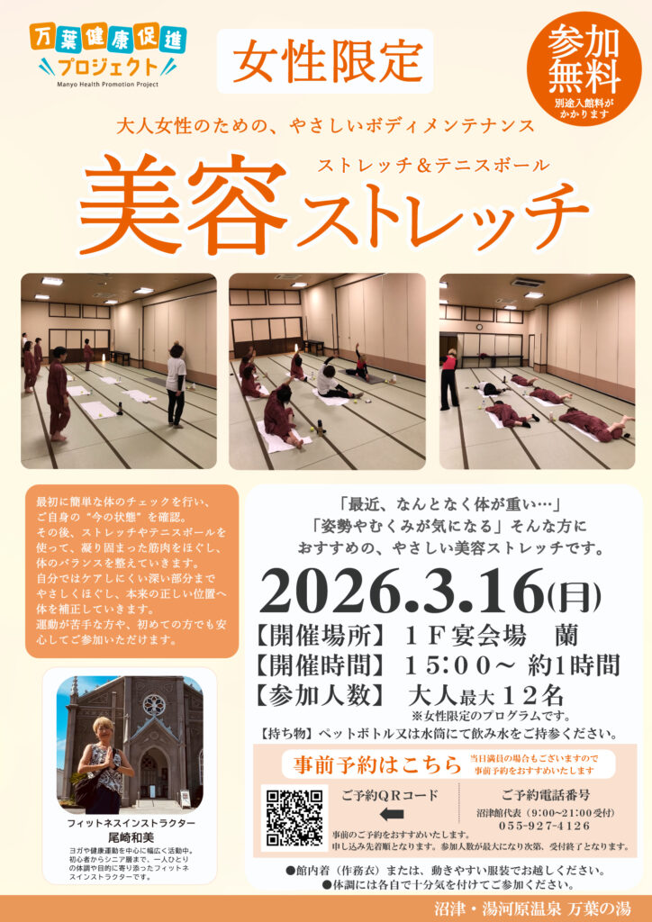 2026.02.10 3/16(月)女性限定!美容ストレッチ 開催場所:1F 宴会場蘭 日時:2026年3月16日(金)15:00~16:00 参加人数:最大12名 (女性大人のみ) ※美容ストレッチは参加無料ですが、別途入館料を頂戴いたします。 ※水分補給できるものをお持ちください。 女性限定!美容ストレッチご予約はこちら