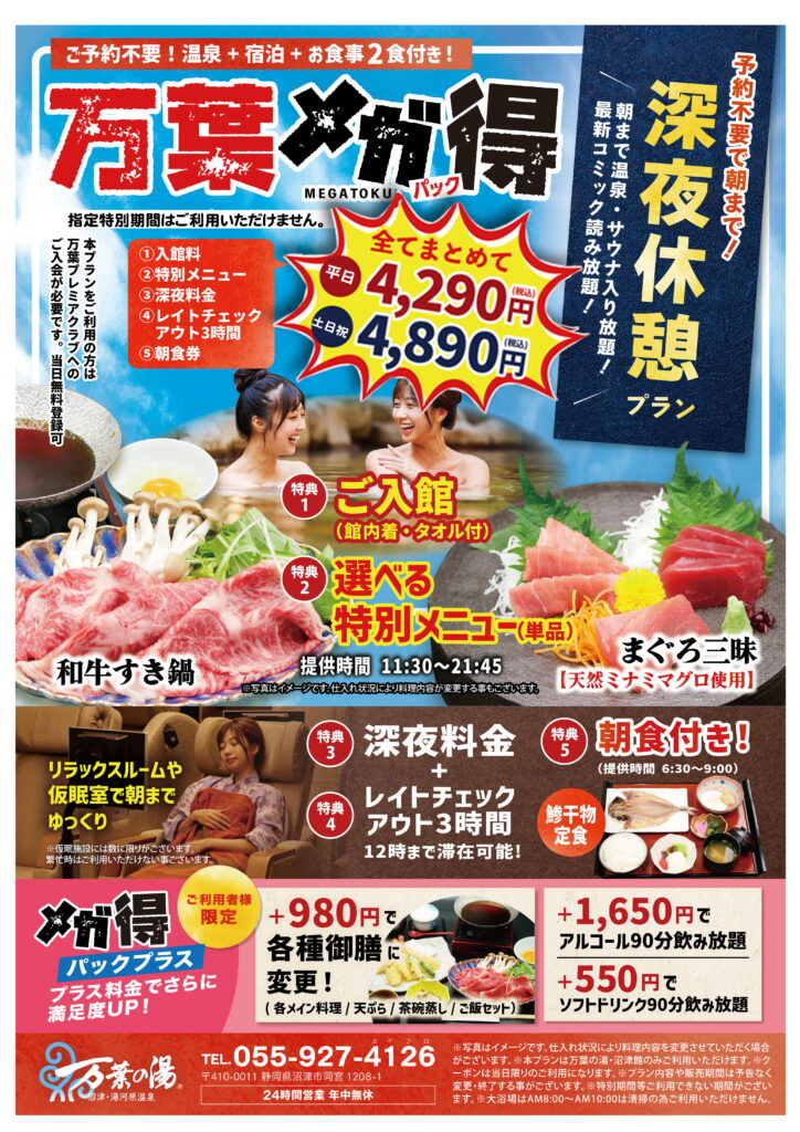 ※沼津・湯河原温泉 万葉の湯(沼津館)でのご利用のみ有効です。