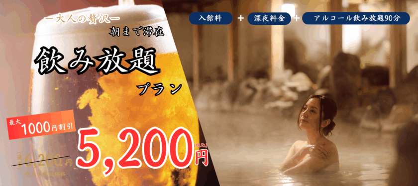 入館料+深夜料金+90分アルコール飲み放題がセットになったお得なクーポンです。