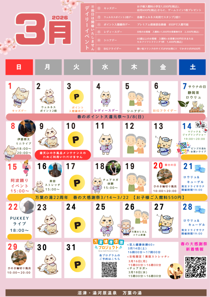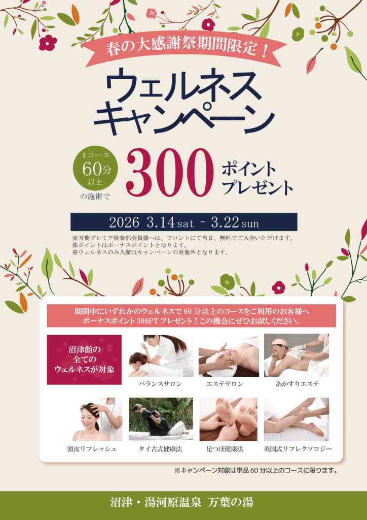 ●ウェルネス1コース60分以上利用で300ポイントプレゼント! 3/14(土)~3/22(日)