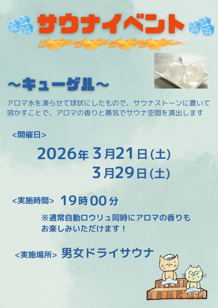 ●キューゲル&ロウリュイベント 3/21(土)、3/28(土)19:00(男女ドライサウナ)