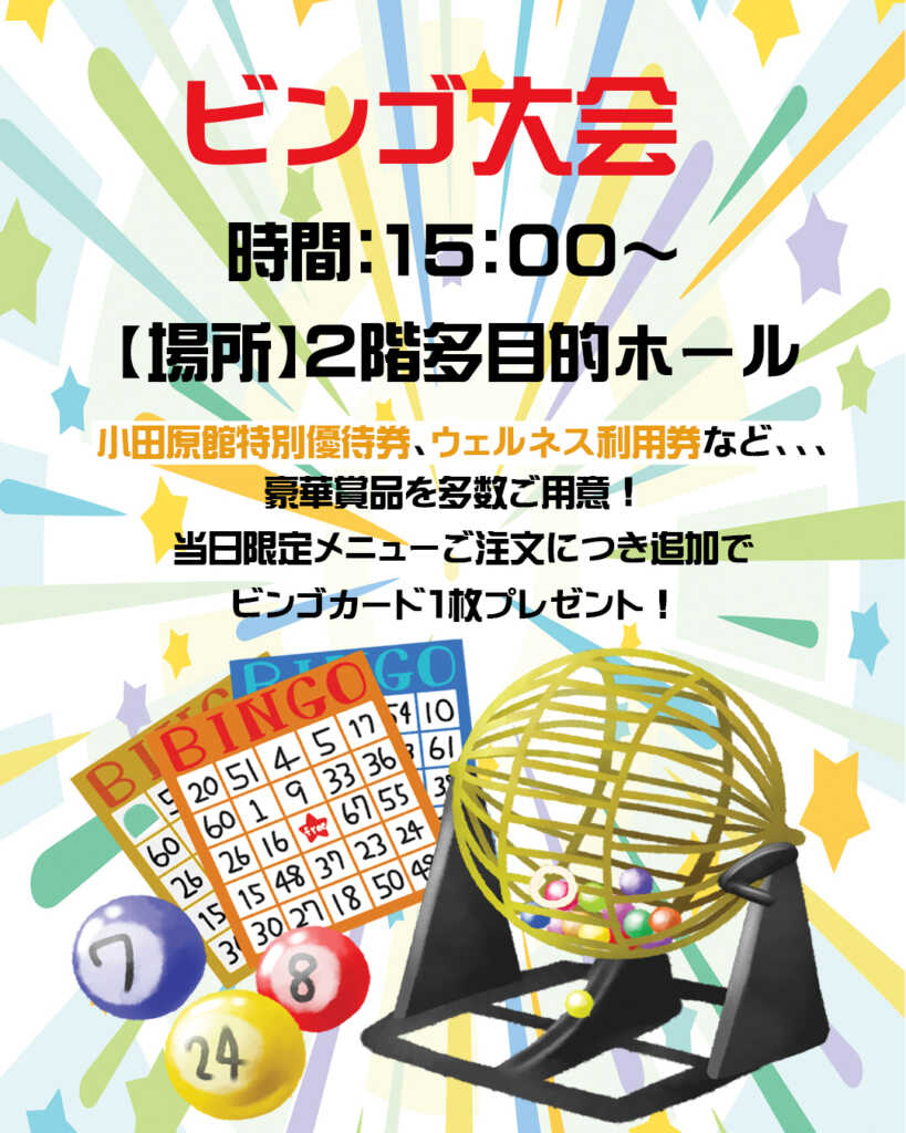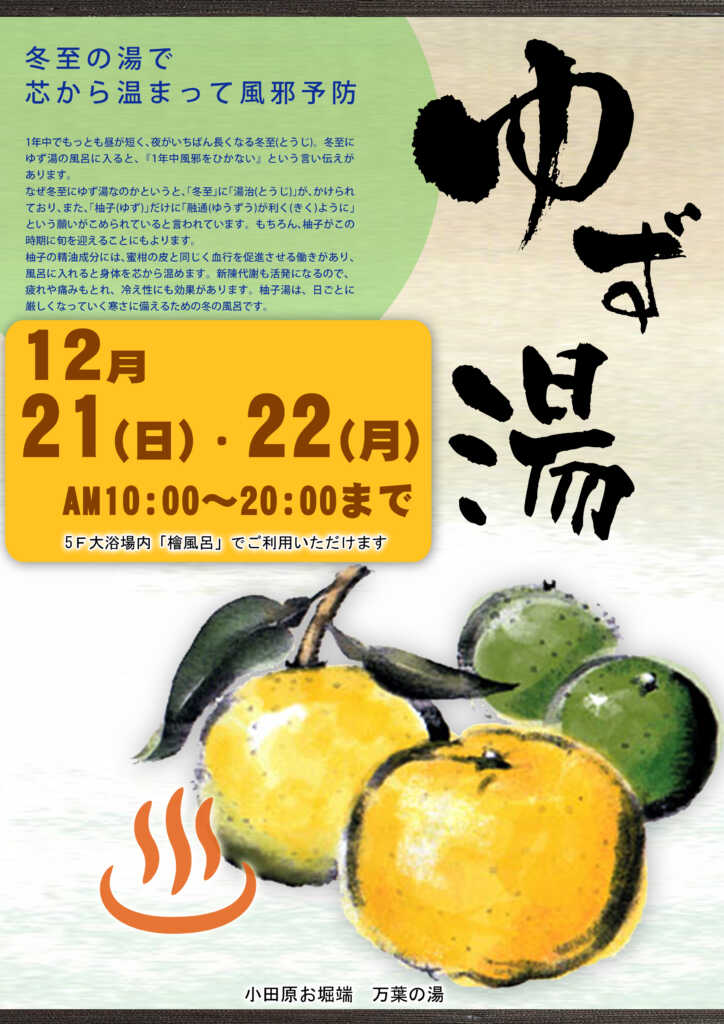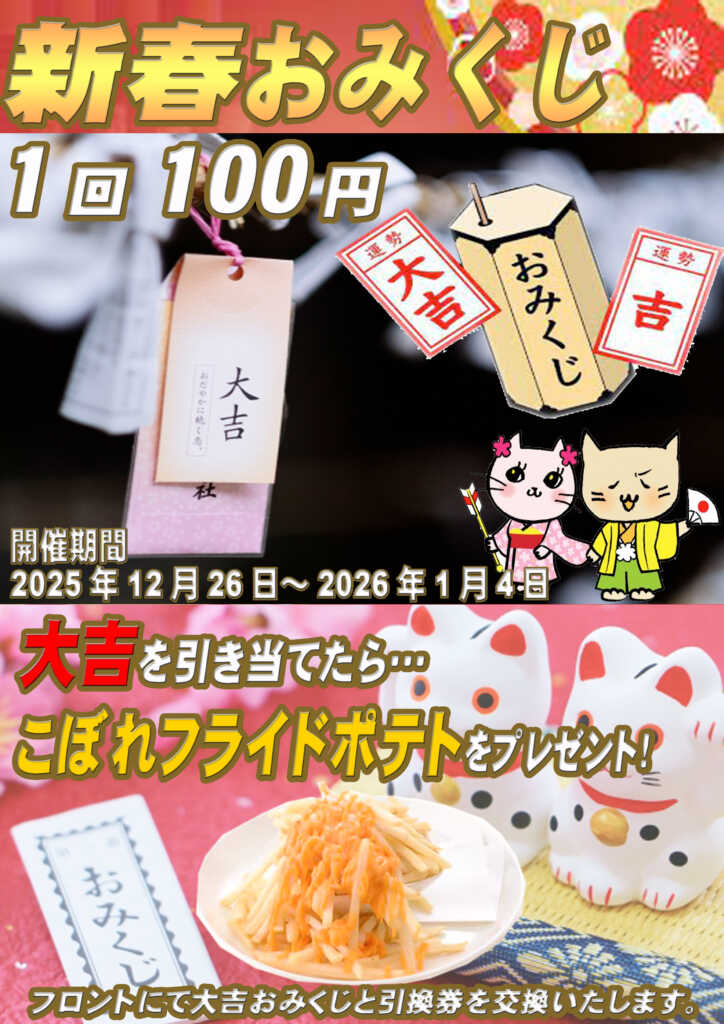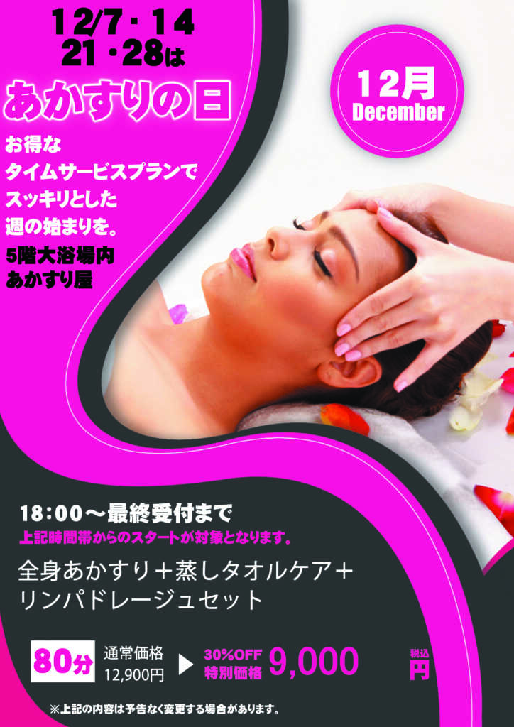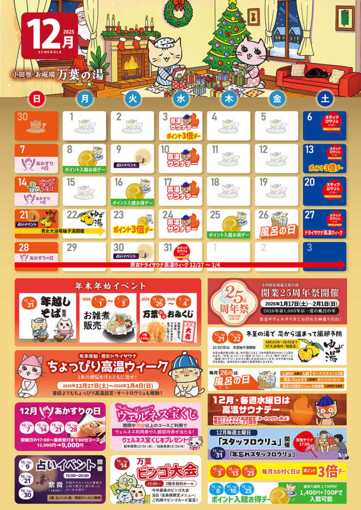 2025.11.30 12月のイベント情報! 今年もあと1ヶ月!12月も万葉の湯で過ごしましょう! 12月のイベントカレンダー! 毎週日曜はあかすりで身体を癒しましょう! あかすりの日 この先の未来をを占いませんか? 占いイベント ビンゴ大会に参加して豪華景品をゲットしよう! 万葉ビンゴ大会! 冬至の湯で芯から暖まって風邪予防! 柚子湯開催! 大吉を当てたらこぼれフライドポテトプレゼント! 万葉新春おみくじ!