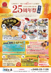 2026.03.20 2026年 小田原館25周年祭 第2弾 小田原館25周年祭第2弾 開催のお知らせ 開催期間:2026年4月17日(金)~4月30日(木) 詳細情報は後日公開させていただきます。 小田原お堀端万葉の湯