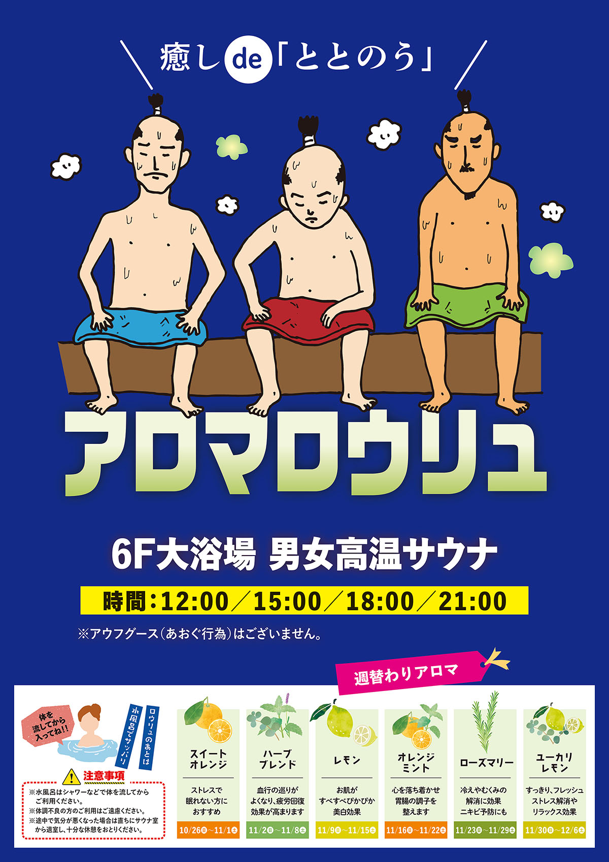 ※おむつ(トレーニングパンツを含む)の取れていないお子様や、おむつ着用の高齢者の大浴場ご利用はご遠慮いただいております。別料金になりますが、一部店舗で貸切りのお風呂もご用意しております。(ご家庭などで使用するベビーバスをご用意しておりますのでそちらをご活用ください。)